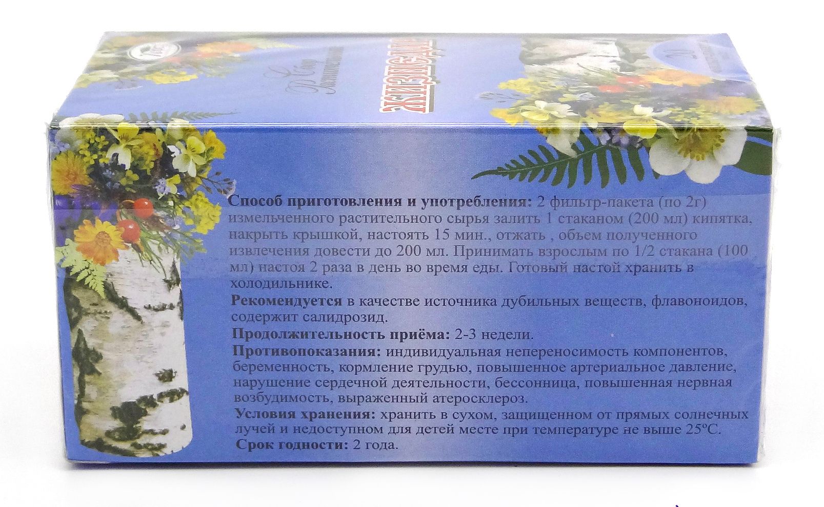 Чага (березовый гриб), корни шлемника байкальского, цветки календулы, корни лопуха обыкновенного, трава герани луговой, корневища с корнями сабельника болотного, корневища с корнями родиолы розовой, соплодия хмеля обыкновенного.Противопоказания: