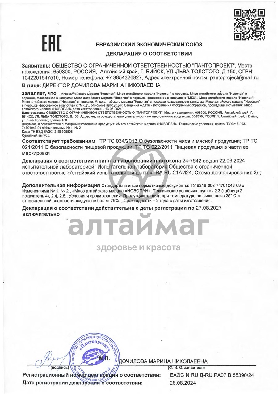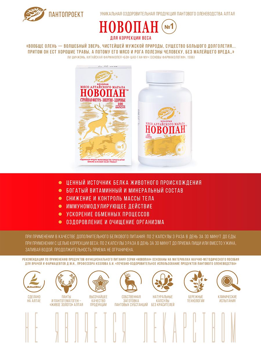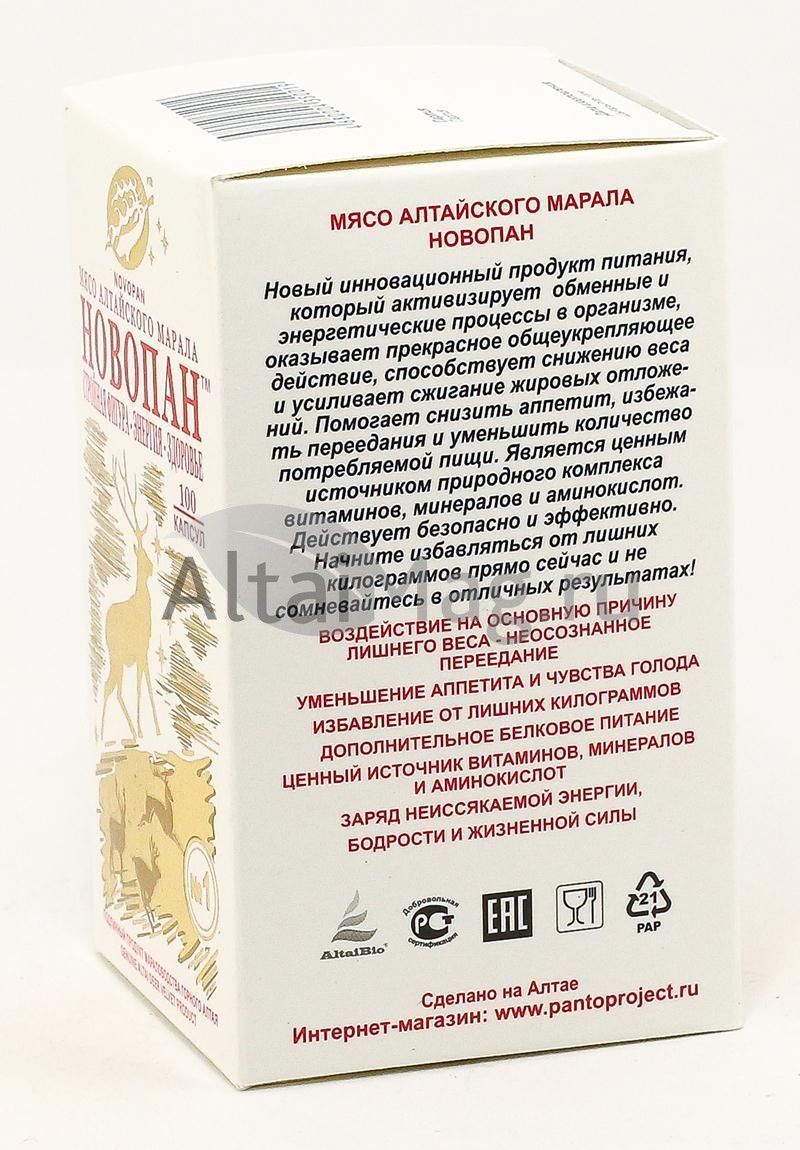 Мясо алтайского марала в капсулах — революционный белковый продукт с выраженными оздоровительными свойствами, ваш личный помощник в борьбе с лишним весом. Порошок мяса в составе продукта получен путем низкотемпературной вакуумной сушки мяса марала с сохранением ценных питательных веществ натурального мяса и его биологической активности. Продукт Новопан № 1 прошел клинические испытания и является эффективным и безопасным средством в борьбе за здоровье и красивую стройную фигуру. Активно повышает жизнеспособность клеток.