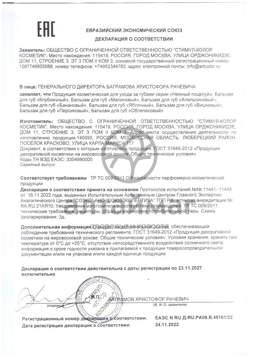 Натуральные воски – пчелиный и карнаубский:Масла виноградной и персиковой косточки поддерживают эластичность и гладкость кожи, заживляют трещины и заеды на губах;