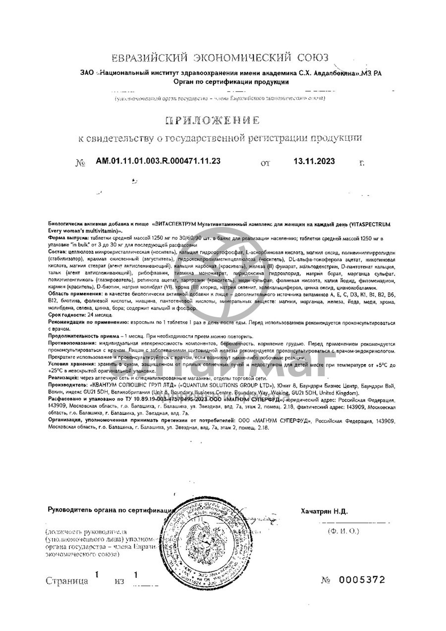 VITASPECTRUM every woman — витаминно-минеральный комплекс, сбалансирован с учетом суточной потребности женского организма в витаминах и минералах. Активные компоненты, входящие в состав, способствуют синтезу коллагена и кератина, предотвращению появления морщин.